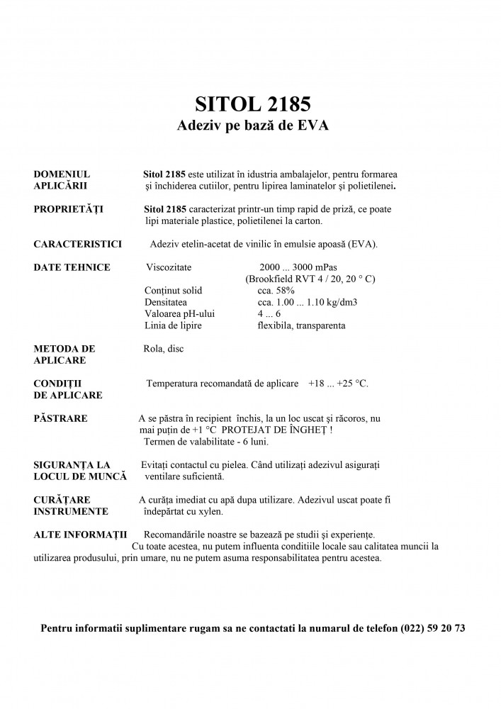 Adeziv in dispersie pe baza de EVA, cu intarire rapida, se aplica in industria de ambalare pentru alipirea cartonului si hartiei la suprafetele laminate cu PE sau PVC, precum si suprafetele acoperite cu lac UV.