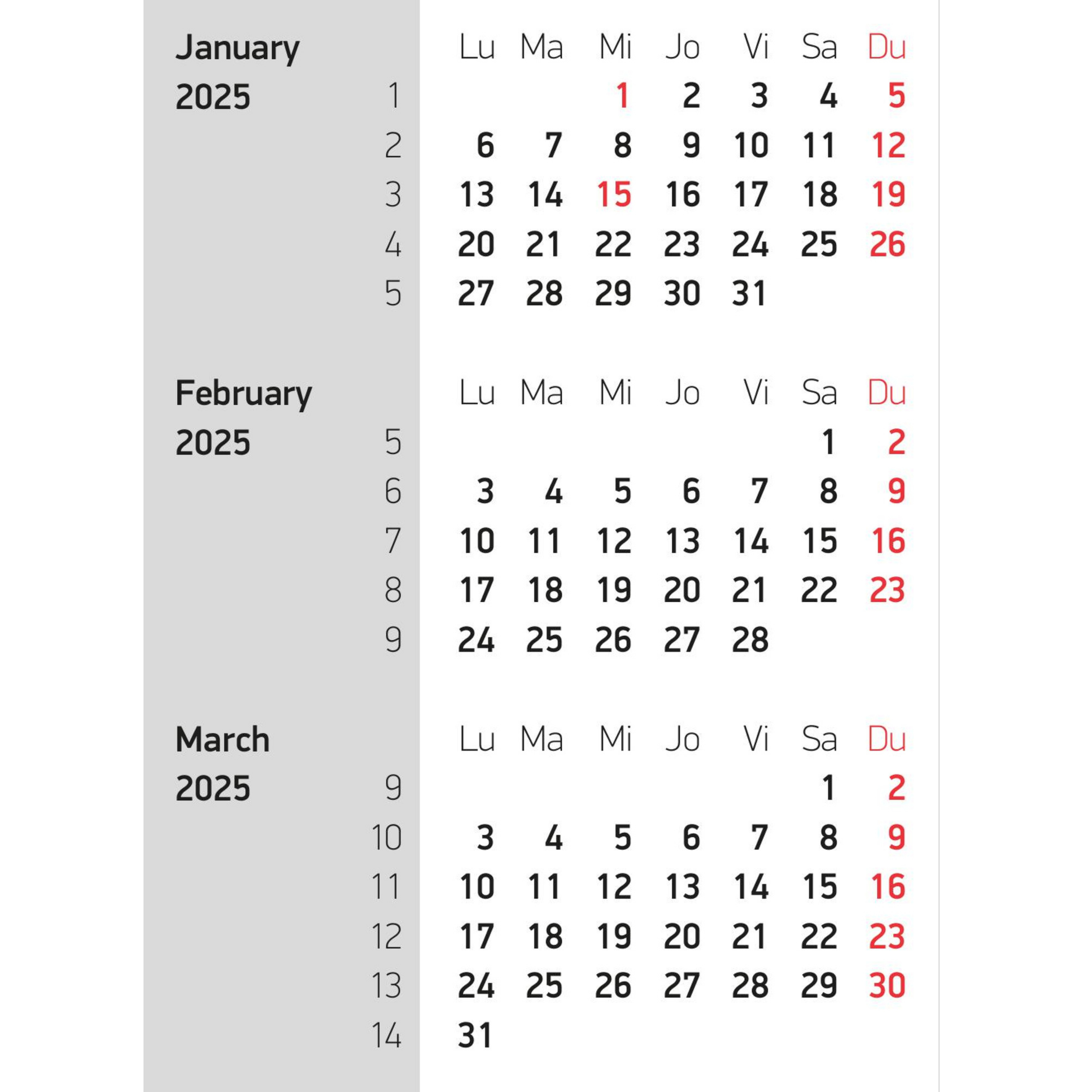 - поворотная ручка: синий скользящий курсор даты, текущий и последующий год, 1 страница = 3 месяца