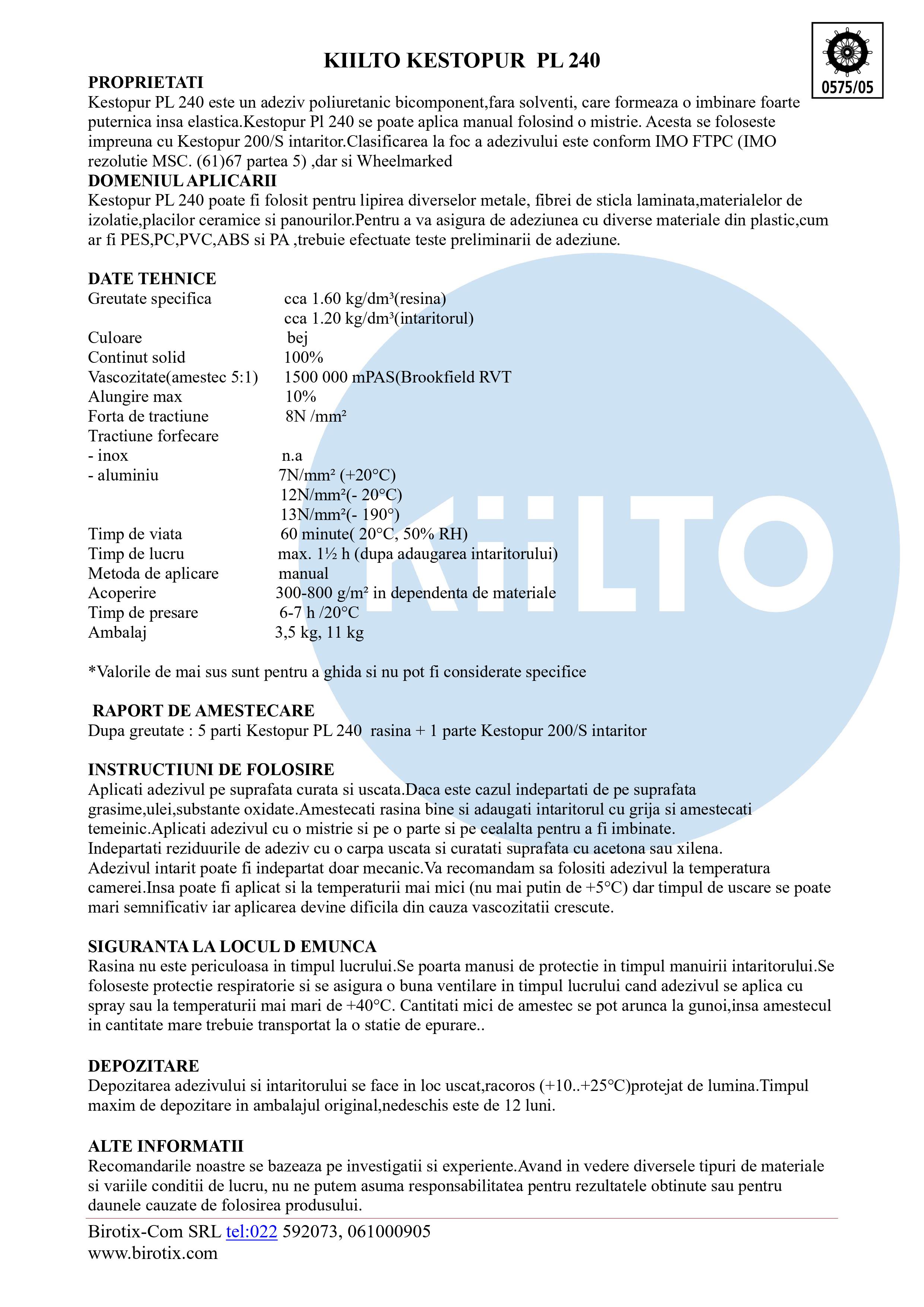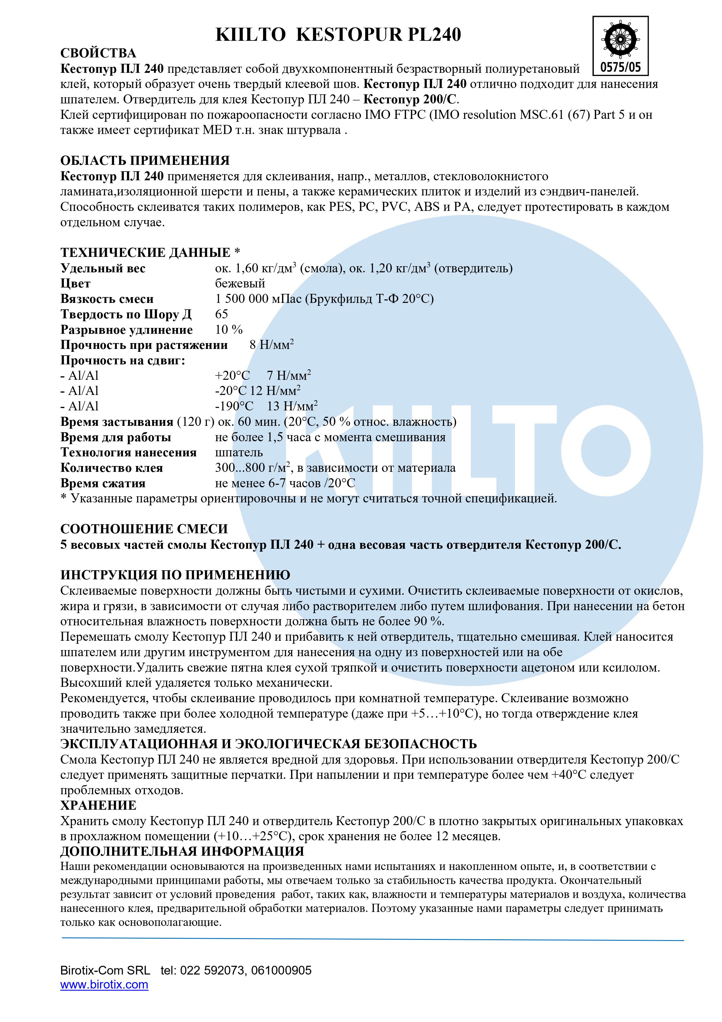• Kestopur PL 240 — двухкомпонентный полиуретановый клей для склеивания металла, дерева и изоляционных материалов, а также волокнистых композитов в конструкциях сэндвич-панелей, для ремонта автофургонов, рефрижераторов.