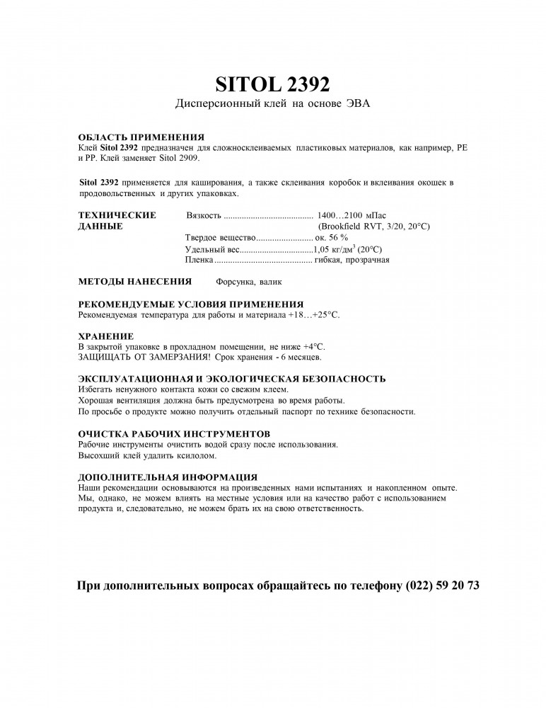 Клей для сложносклеиваемых пластиковых материалов, как например, PE и PP. Клей заменяет Ситол 2909. Ситол 2392 применяется для каширования, а также склеивания коробок и вклеивания окошек в продовольственные и другие упаковки.